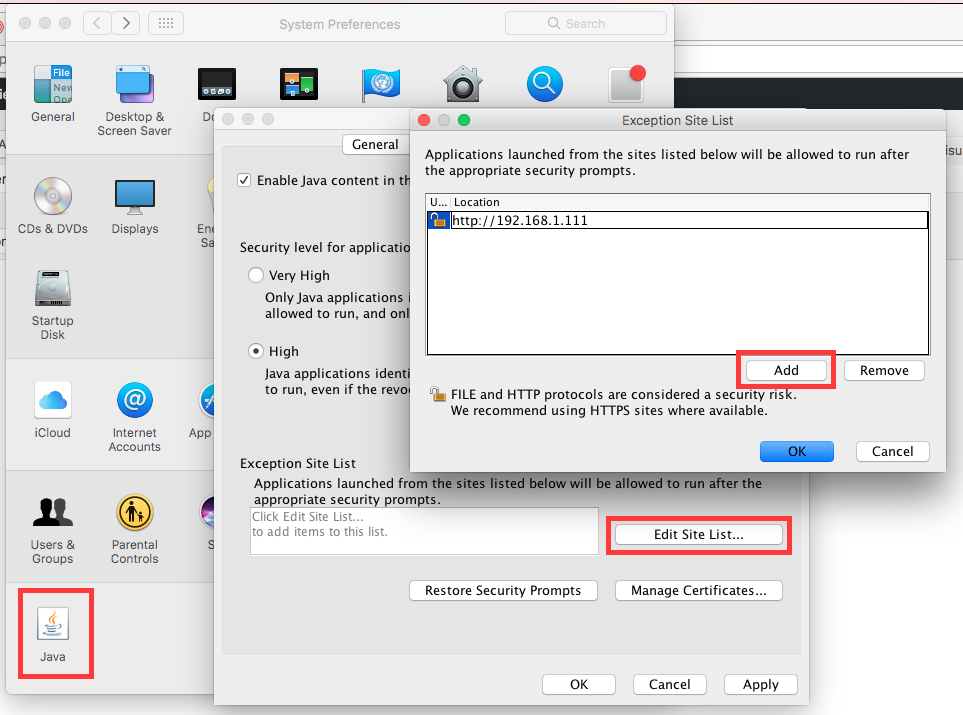 Open System Preferences, Java settings and add IP address of your KVM to the list: