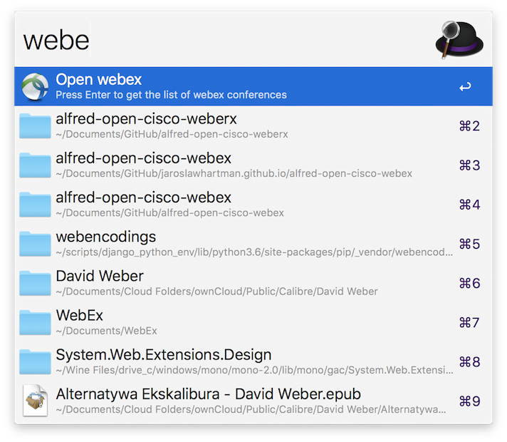 Ok, how you could add your most frequently used Webex URLs to the list? Navigate to Alfred workflows, find Webex workflow and select Open in Finder: