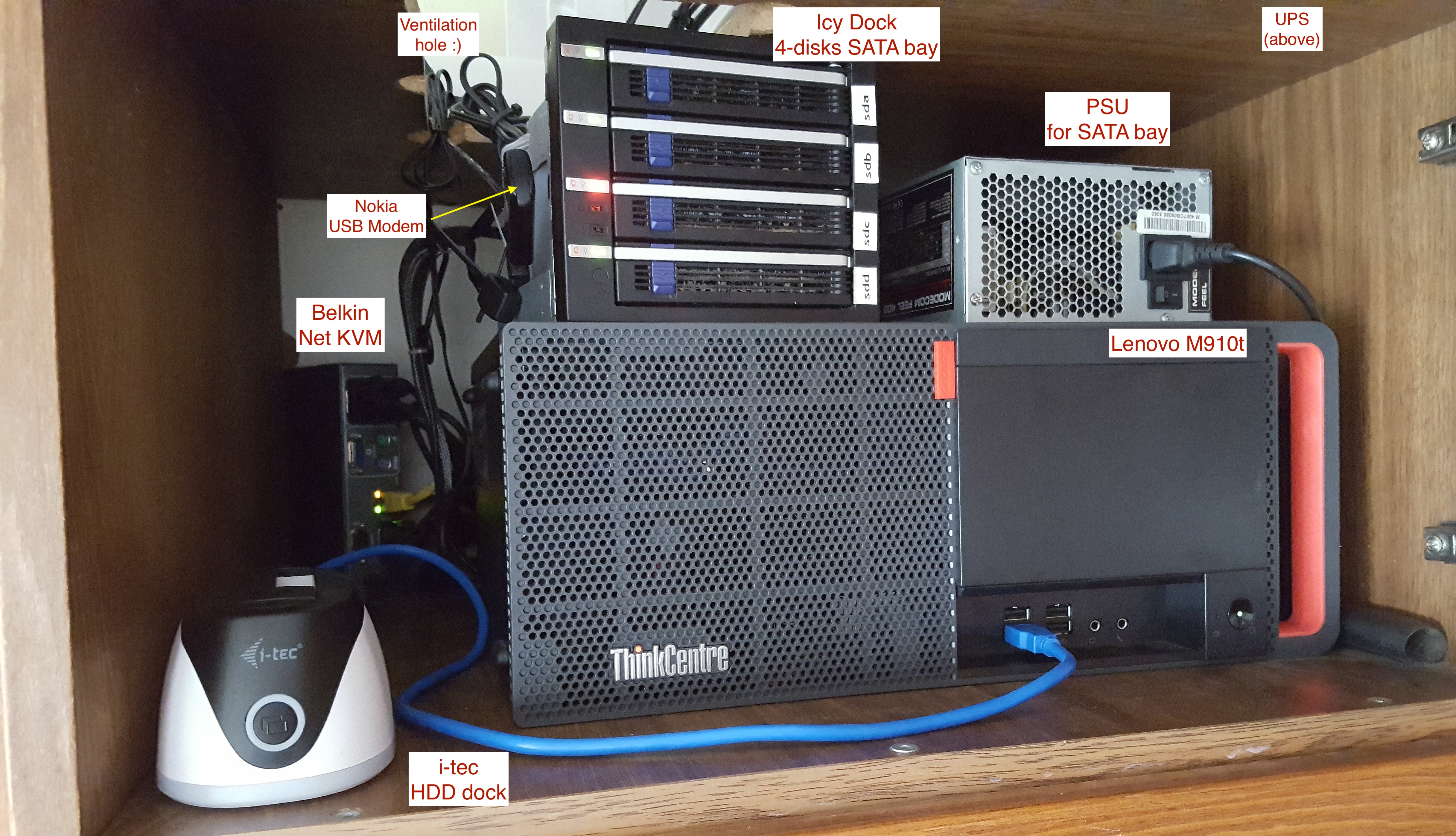 - On-demand backups are made to a 4 TB SATA HDD using i-tec USB HDD dock