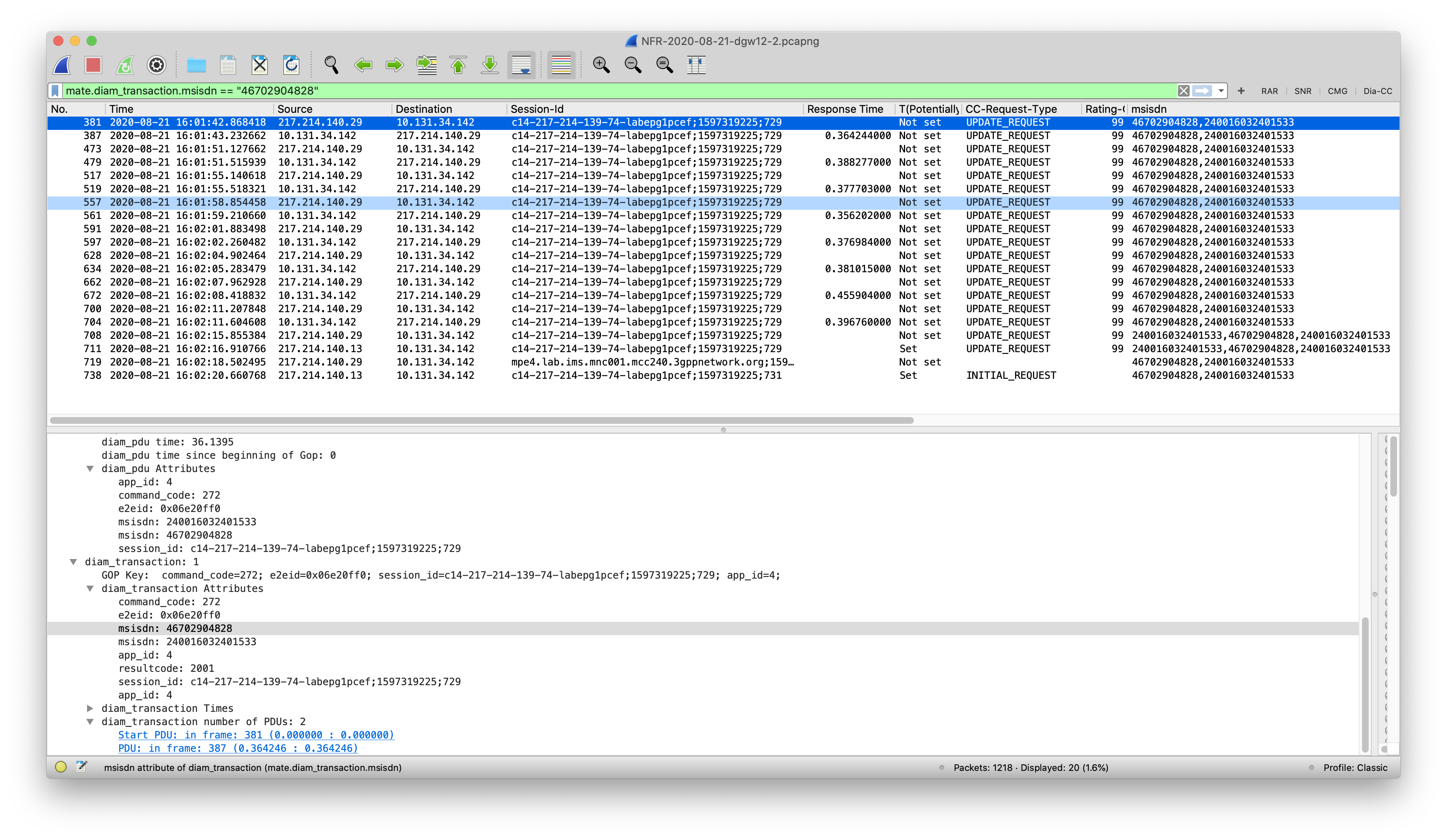 mate.diam_transaction.msisdn == "46702904828"In result, Wireshark will filter all CCR and CCAs where this subscriber is involved:
